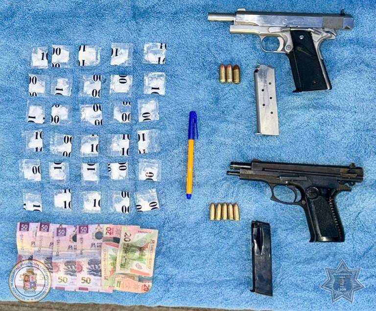 León, Guanajuato. Marzo 6, 2026. Como resultado de los patrullajes preventivos y la vigilancia en colonias del municipio, la Policía Municipal detuvo a un hombre y a una mujer en posesión de armas de fuego y droga en la colonia Piletas I y II.